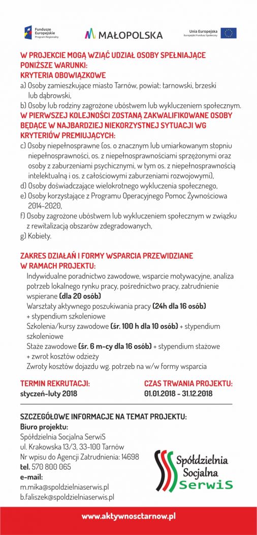 W ramach projektu oferowane są: staże zawodowe, szkolenia zawodowe, zwrot kosztów dojazdu, wsparcie doradcy zawodowego i pośrednika pracy i inne formy wsparcia. Uczestnik nie ponosi żadnych kosztów.